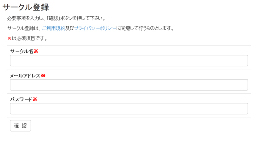 サークル名・メールアドレス・パスワードで登録出来ます。