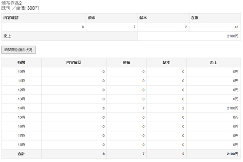 「時間別頒布状況」を押すと、その作品について1時間毎の売上金額と各種数量(内容確認・頒布・献本)が表示されます。